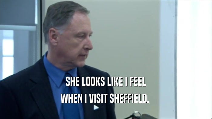 There was a line in Armando Ianucci’s TV show, The Thick of It, where Glen says about a colleague going through a political crisis, “She looks so glum. She looks like I feel when I visit Sheffield”. I remember watching that episode in a time before streaming and doing a spit take - the mingled indignation (how dare they!) mixed with local pride to be recognised on the BBC.