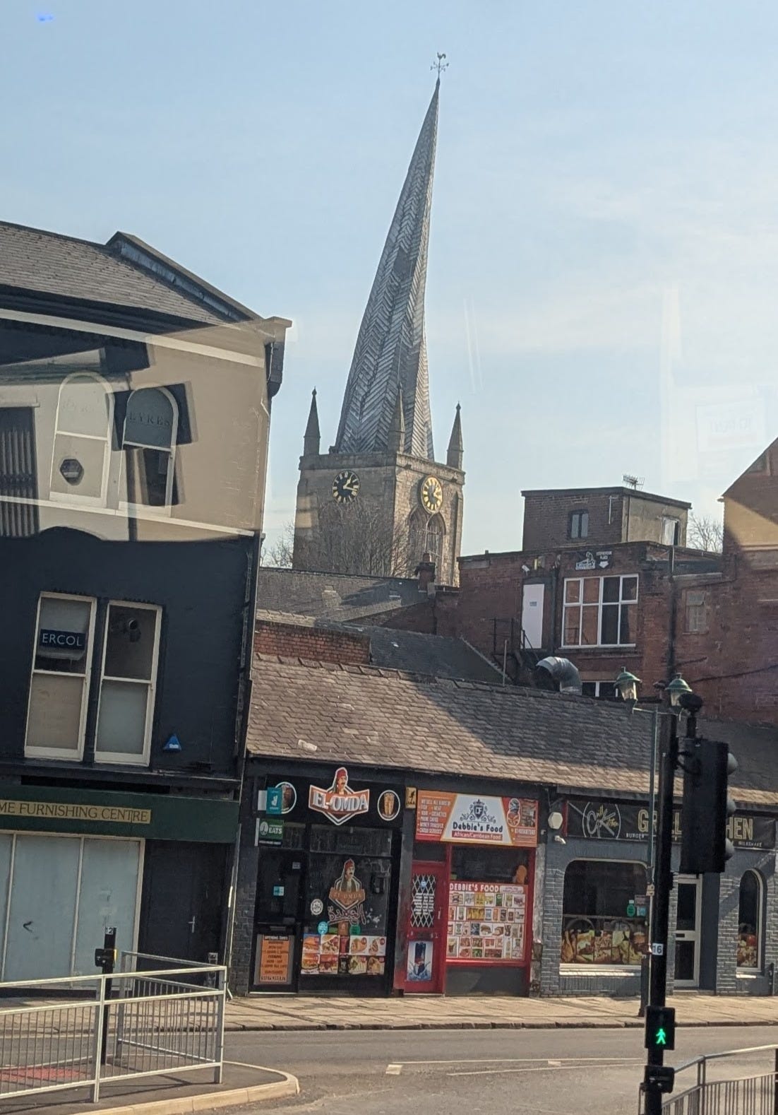 The Crooked Spire at Chesterfield, telling you you’re 20 minutes away from home.