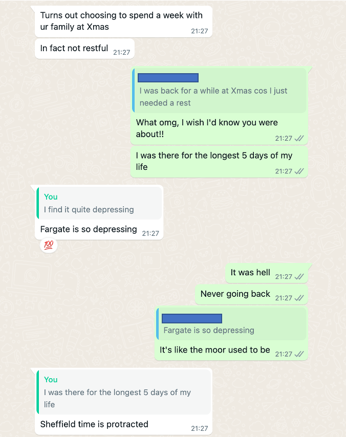 A visit starts with three hours of euphoria to be back on home soil, tramping hills, breathing clean air and drinking soft water; rapidly followed by crushing despair. It’s like being haunted by the ghost of Christmas Past. Most of my good memories of Sheffield have been sizzled from my brain by the bad ones.